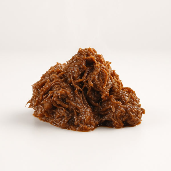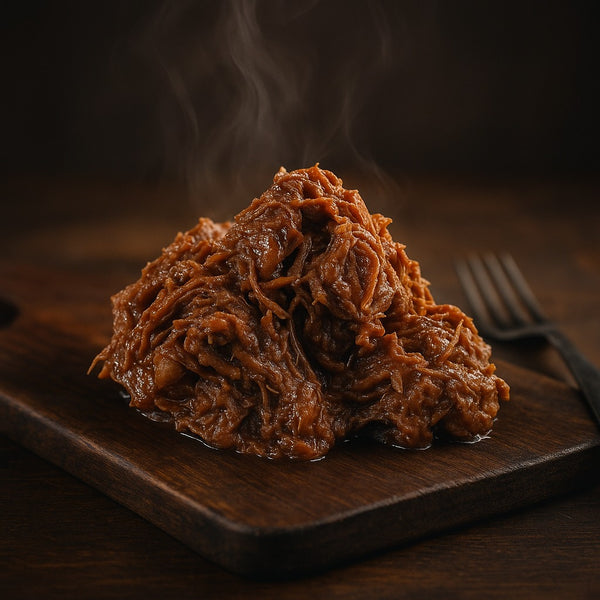 Caja cerrada de 7 Kg de carne mechada desmenuzada de cerdo cocinada lista para calentar y servir.